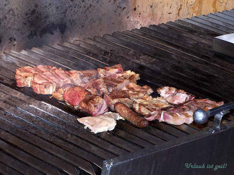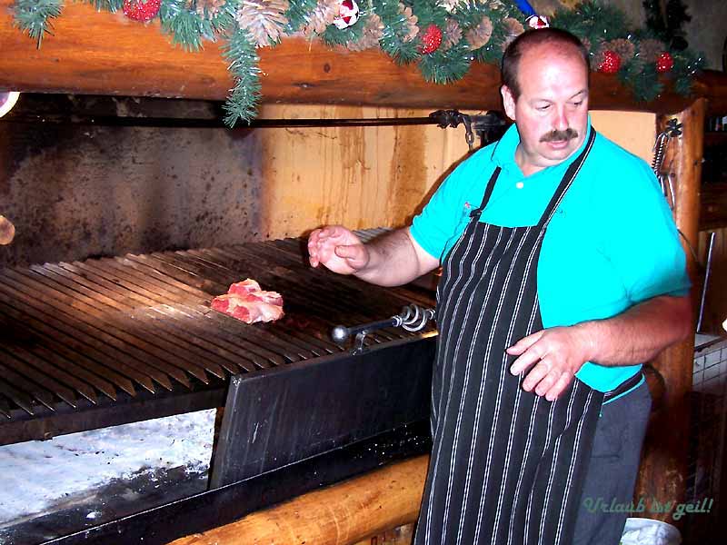 Bei einem Bummel zu fünft durch den beschaulichen Ort kosteten wir das vorzügliche argentinische Eis. Es gab überall Läden mit haufenweise Schokolade und anderen Süßigkeiten in denen man sich zunächst an der Kasse anstellen musste um einen Bon zu kaufen und danach noch einmal am Eisstand wartete, um gegen den Bon sein Eis zu erhalten. Mittags kehrten wir in ein landestypisches Restaurant ein, wo wir beobachten konnten, wie unser 400-Gramm-XXL-Fleisch vom Filetstück geschnitten und auf dem Grill hervorragend gegart wurde - es schmeckte super! Der vom Wirt empfohlene selbstgemachte Himbeersaft hingegen war etwas zu süß. Unsere Frauen ließen sich den gebackenen Käse schmecken.