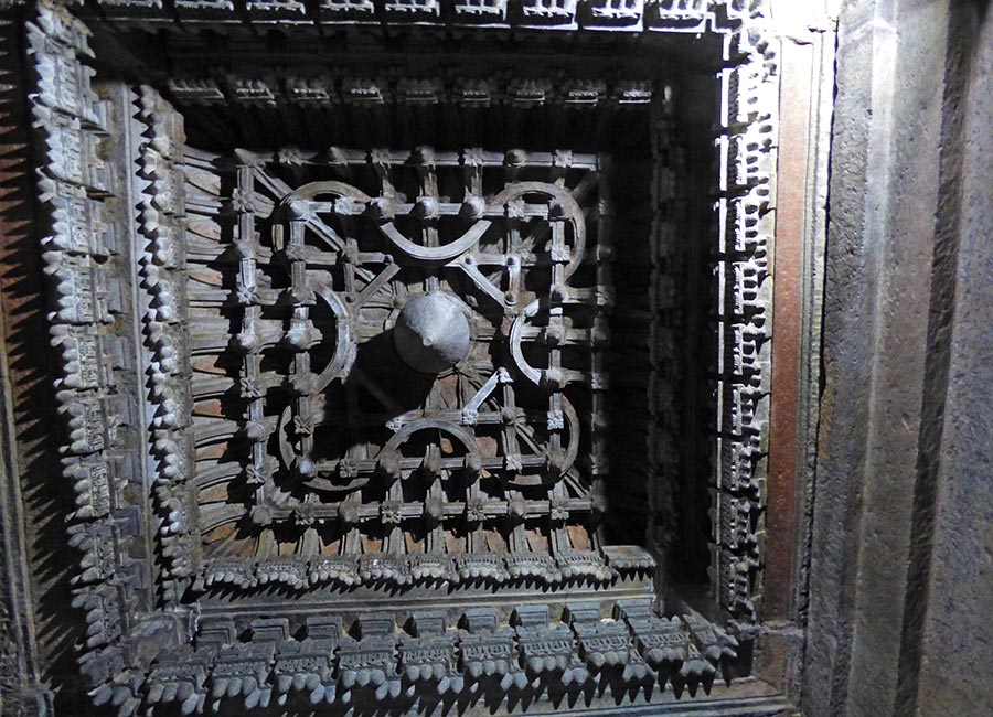 Zwischen den Säulen ist die Decke sehr aufwendig gestaltet. In den drei Schreinen sind Götterfiguren zu sehen.