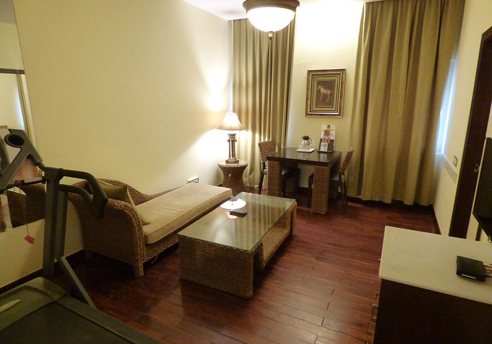 Das Ambiente beim Abendbuffet war ungemütlich, da gleichzeitig eine lautstarke französische Reisegruppe angekommen war. Auch der Durchgang zum zweiten Speiseraum war eine Zumutung. So verzogen wir uns alsbald nach einem kleinen Rundgang durch die Hotelanlage, den Kraftraum und den Pool in unser riesiges Zimmer. Eigentlich waren es zwei Zimmer und zwei Bäder.