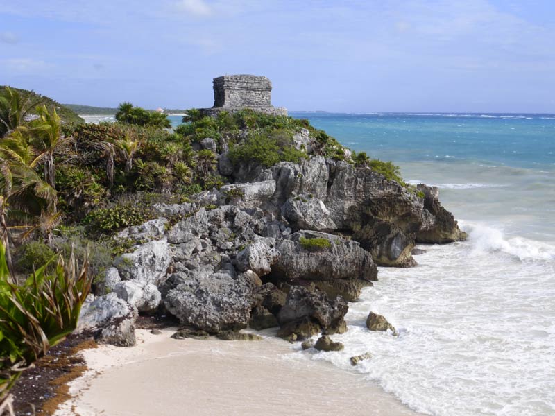 Als wir Tulum erreicht hatten, wurde es immer schöner und am Ende hatten wir strahlenden Sonnenschein, so dass wir in Ruhe eine gemütliche Runde durch die Anlage liefen. Der Tempel der Winde hoch auf der Klippe, der Freskentempel und einige andere restaurierte Gebäude waren sehr interessant.