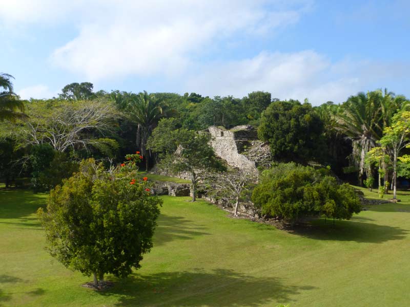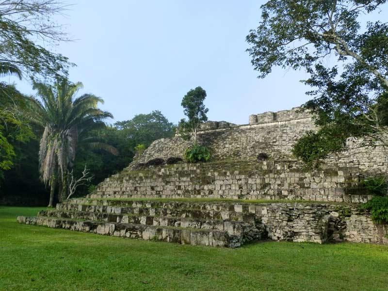 Vom Frühstück gesättigt, machten wir uns zeitig auf den Weg, um noch vor anderen Gruppen in Kohunlich zu sein. Wir erreichten die Stätte dann auch noch im leichten Morgendunst und sie machte dadurch einen sehr mystischen Eindruck. Die Tempel lagen mitten in wild wuchernder Natur und wir hatten nach einer Erläuterungen von Maria genug Zeit, um uns alles in Ruhe anzusehen.