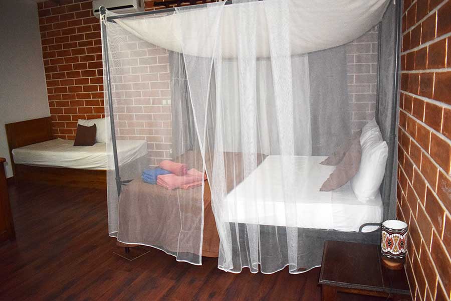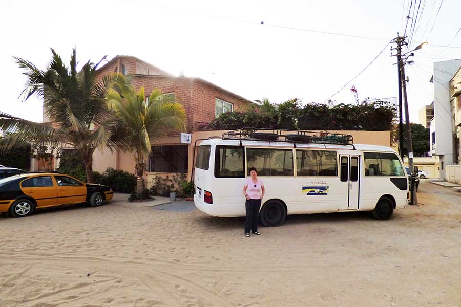 Mamadou telefoniertete mit dem Busfahrer Abraham und nach fünf Minuten konnten wir in den für afrikanische Verhältnisse komfortablen Bus einsteigen. Das Gepäck wurde auf dem Dach verstaut, dort mit einem Netz gesichert und ab ging es in das 60 km entfernte Hotel "Casa Mara".