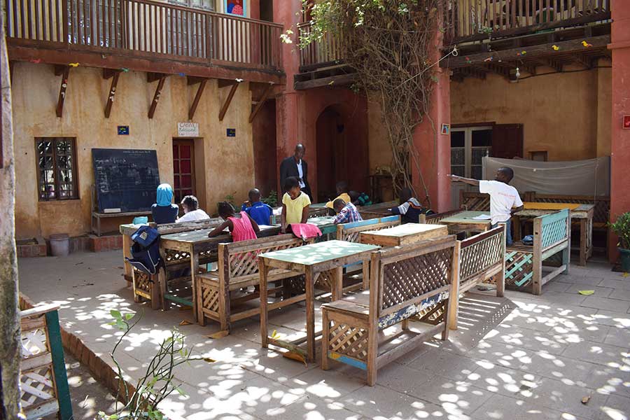 Nach einem akzeptablen Frühstück fuhren wir 9 Uhr mit dem Bus zum Terminal für die Fähre auf die Insel Gorée. Mamadou hatte organisiert, dass unterwegs ein Mann in den Bus zustieg, bei dem man Geld wechseln konnte. Am Terminal angekommen, stellte sich Mamadou nach Tickets an und als er nach 10 Minuten fertig war, dachten wir, dass es nun losgeht, denn er hatte uns gesagt, er habe für uns die 10 Uhr-Fähre reserviert.