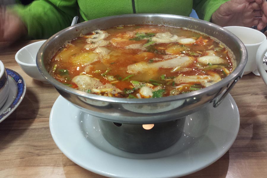 Wir wählten uns Rind und Lamm aus und warteten, bis genügend Platz am Grill frei wurde - dann legten wir los. Zum Fleisch konnte man sich verschiedenen Grillsoßen aussuchen. Diese Art der Zubereitung hat uns ausgezeichnet gefallen und auch sehr lecker geschmeckt.