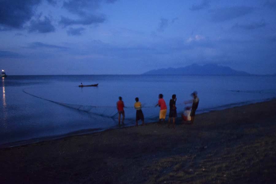 Im Resort machte Monika am späten Nachmittag einen Strandspaziergang, fotografierte den Sonnenuntergang und beobachtete, wie die Fischer am Strand den Fang in ihrem Schleppnetz einholten.