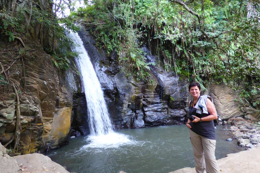 15.00 Uhr fuhr unser netter Busfahrer einige von uns in den Ort Moni, da wir uns dort unter anderem den Wasserfall anschauen wollten. Am Eingang zum Wasserfall spitzten zwei junge Mädchen mit sehr scharfen Macheten Bambusstangen an. Der kurze Weg über einen baufälligen Steg führte uns zum im Grünen liegenden Wasserfall.