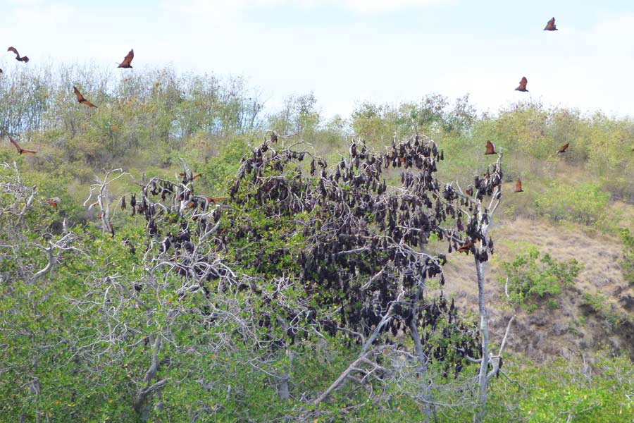 Als erstes konnten wir vom Boot aus eine Insel beobachten, wo tausende Flughunde an den Ästen der Bäume hingen und sich nach und nach, aufgescheucht von den Motorgeräuschen, in die Luft erhoben.