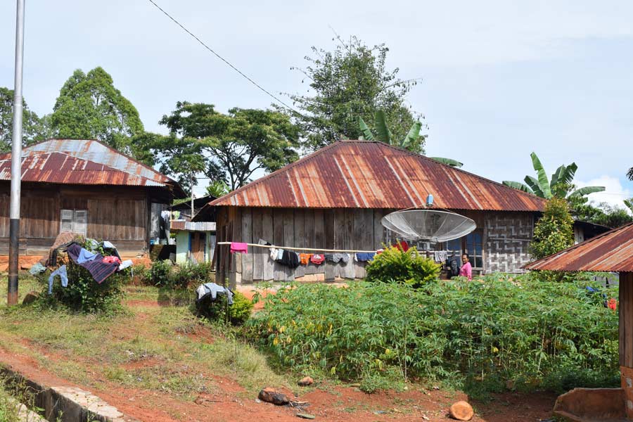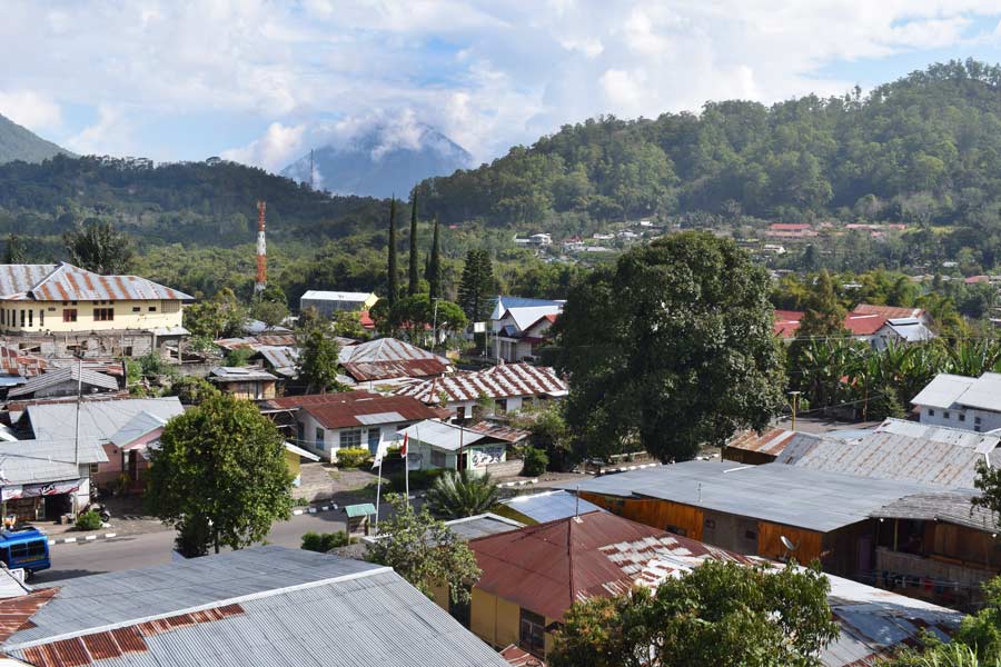 Heute morgen sah das Wetter besser aus. Nach dem Frühstück um 7.30 Uhr mit drei Scheiben Toast, Rührei und Marmelade stiegen wir 8.30 Uhr in den Bus und erreichten nach einem Fotostopp mit einem Blick auf den Vulkan das 16 km entfernte Bena Village.