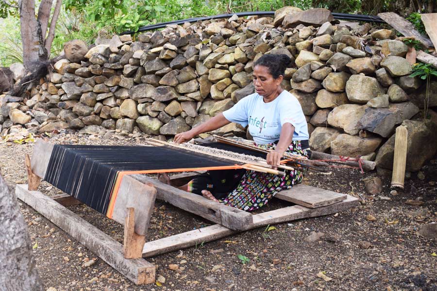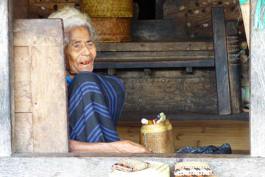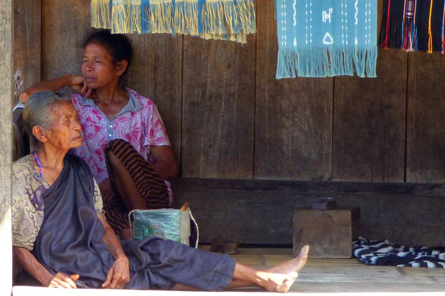 Die flach aufgestapelten Steine (Lenggi) sind ein Ort, wo die Clans über bestimmte Rechtsstreitigkeiten entscheiden. An den Häusern fanden wir wie bereits auf Sulawesi Schädel und Hörner von Wasserbüffeln und Schweinekiefer, die bei Zeremonien geopfert wurden. Die meisten Frauen waren mit dem Weben von Tüchern beschäftigt, die zum Verkauf angeboten wurden.