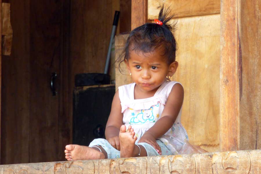 Auf der Wanderung zurück zum Resort schauten wir uns den wenig spektakulären Ort Moni an, kauften bei einer freundlichen Familie fünf Bananen und sahen einen Mann mit brennender Zigarette sein Moped betanken. Außerdem fotografierten wir meine Moni an einigen Ortsschildern mit ihrem Namen.