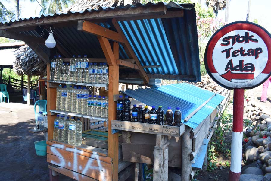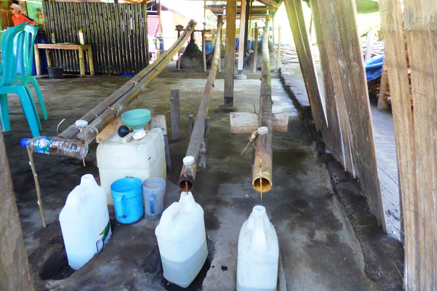 Heute ging die Route bei total klarer Sicht um 8 Uhr weiter nach Ruteng. Unterwegs besuchten wir an der Südküste in Aimere eine Brennerei, in der das beliebte alkoholische Getränk Arak hergestellt wurde. Es war interessant, mit welch einfachen Mitteln aus dem Saft der langen Palmfrüchte Schnaps destilliert wurde. Auch hier wurde Bambus als Material eingesetzt; diesmal als Rohrleitung. Wir kauften uns eine Flasche mit einem halben Liter 50 %igen Arak für 75.000 Rupien.