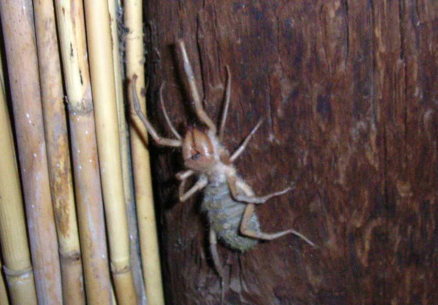 Beim Duschen sorgte eine furchterregende Spinne auf der Damen-Toilette für ziemliche Unruhe, die sich aber dann in einer Ritze verkroch. Ich begegnete ihr am nächsten Abend wieder und beobachtete, wie sie einen etwa Maikäfer großen schwarzen Käfer, der sich in einer Ritze der Treppe zu retten versuchte, mit ihren mächtigen, einem Seitenschneider ähnelnden Beißwerkzeugen packte, dass man es knacken hörte und mit der Beute über den Volleyballplatz vor den Waschräumen in ihr Versteck eilte.
