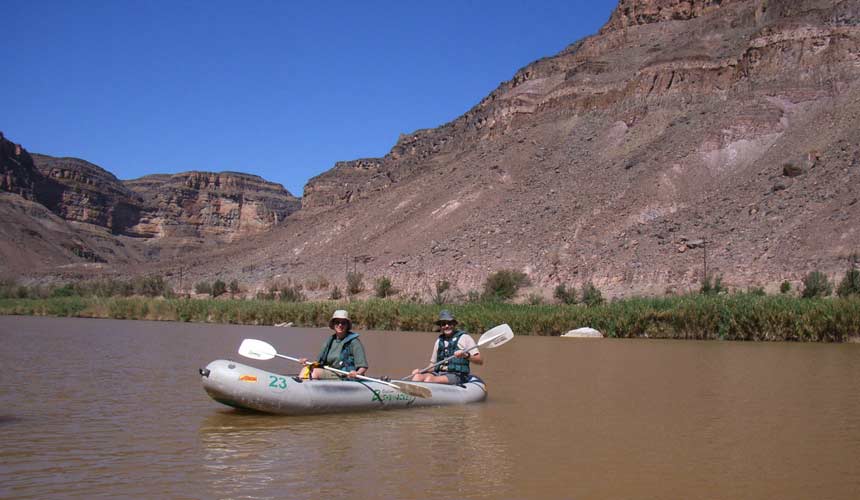 Wir waren dann acht Leute, die in das mit den Schlauchboten beladenen Fahrzeug stiegen und stromaufwärts gefahren wurden. Die Paddelfahrt durch die wunderschöne Landschaft, auf der uns ein Guide begleitete, war ein tolles Erlebnis, in dem durch einige Untiefen und kleine Stromschnellen sorgten für genug Abwechslung und Spannung aber auch jede Menge Spaß. Nachdem unsere fünf Boote wieder heil im Camp angelegt hatten, erwartete uns gegen 12.30 Uhr das Lunch mit Makkaroni und Hühnerfleisch. Den Nachmittag verbrachten wir mit Umherspazieren, Karten schreiben oder Faulenzen. Es gab auch einen kleinen Shop, der aber bereits ab 17 Uhr geschlossen wurde.