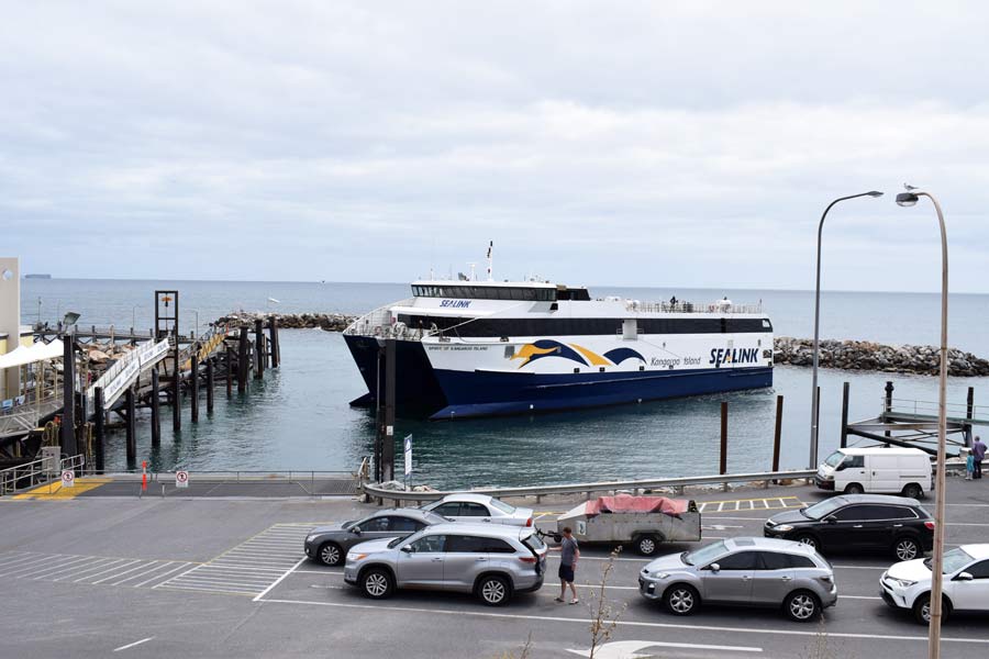 Gegen 15.00 Uhr erreichten wir Cape Jervis und schauten zuerst an der Anlagestelle vorbei, wo gerade eine Fähre von Kangaroo Island anlegte. Uns interessierten vor allem die Parkplätze, da wir morgen unser Auto hier abstellen wollten, um allein überzusetzen, da es preiswerter war, auf der Insel einen Wagen zu mieten als die teure Überfahrt für den PKW.