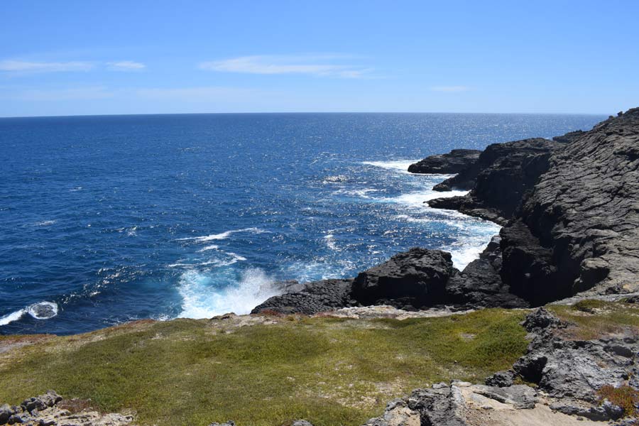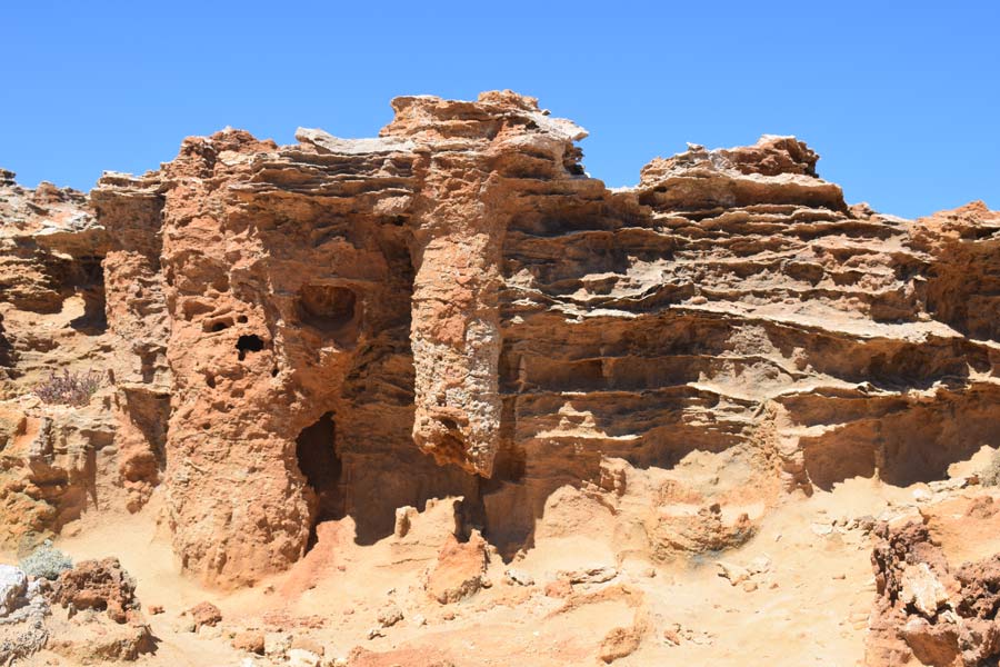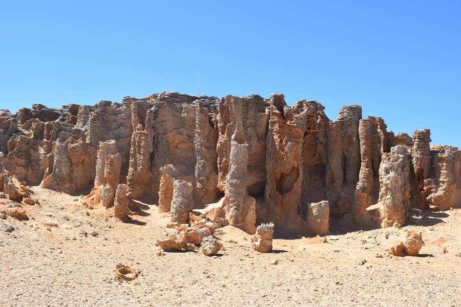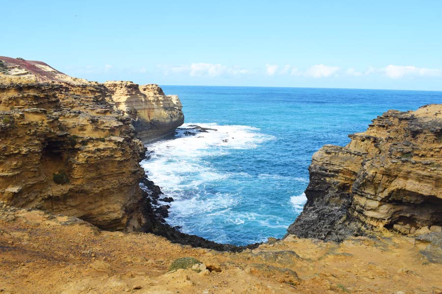 Um 13 Uhr kauften wir bei redkite in Warrnambool Tee, Avocadocreme, Wasser und Würstchen ein. Hier musste man alles selbst einscannen und dann bezahlen. Der weitere Weg führte uns zum versteinerten Wald, dem Petrified Forest in der Nähe von Cap Bridgewater. Hier gibt es eine Menge versteinerter Bäume von ein bis drei Metern Höhe entlang der Steilküste. Neuere Theorien gehen allerdings davon aus, dass die Säulen nicht von Bäumen stammen, sondern Röhren aus Kalkstein sind, die sich in Millionen von Jahren durch Regenfälle bildeten. Das Wasser sammelt sich in einer kleinen Senke und löst den Kalkstein nach unten, wodurch röhrenförmige Gebilde entstanden sind.