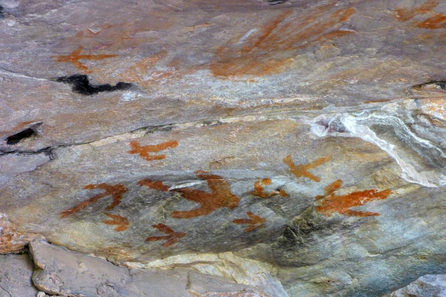 Und der Versuch wurde belohnt, denn nach 100 Metern standen Hinweisschilder, die durch einen Buschbrand fast unleserlich geworden waren, auf denen der Name "Ngamadjidji" zu entziffern war. Nach weiterer Suche durch Gestrüpp entdeckten wir dann die Höhle mit sehr schönen Darstellungen von Menschen.