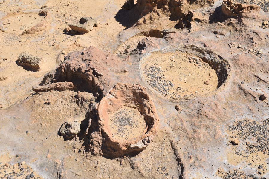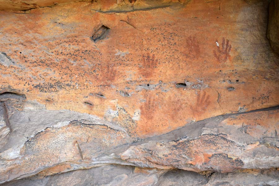 Nach dem Rückweg auf den Parkplatz fuhren wir über Sandstraßen weiter zur Cave of Hands (Wab Manja), die leichter zu finden war. Auf dem Parkplatz war der Wanderweg zur Höhle allerdings durch ein rot-weißes Band wegen Bauarbeiten abgesperrt. Ich wollte schon umkehren, aber Monika meinte, dass wir es trotz Verbotsschildes versuchen. Gesagt - getan. Nach 100 Metern hatten wir die lächerliche "Baustelle", die aus einem einbetonierten Rohr bestand und mit einem großen Schritt zu übergehen war, passiert und ein ca. 1 km langer Wanderweg führte uns auf ein Felsplateau auf der wir dann die Höhle mit den verschiedenfarbigen Handabdrücken fanden.
