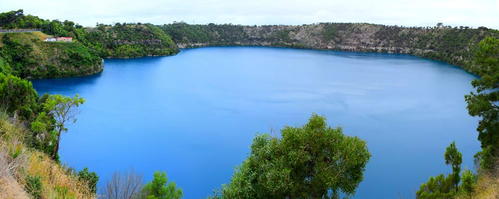 Auf dem weiteren Weg begegneten uns viele Schafweiden aber ganz selten ein Fahrzeug. 12 Uhr waren wir in Dartmoor und fuhren weiter nach Mount Gambier zum Blauen See. Dort gingen wir zunächst Mittagessen in das thailändische Restaurant "Wild Ginger" und aßen Hähnchen mit Erdnusssoße und Gemüse sowie eine Lemongras-Suppe. Leider war es heute bewölkt und es nieselte immer mal zwischendurch. So fuhren wir einmal um den blauen See und hielten an zwei Aussichtspunkten.