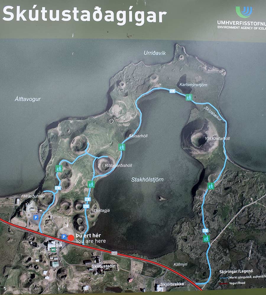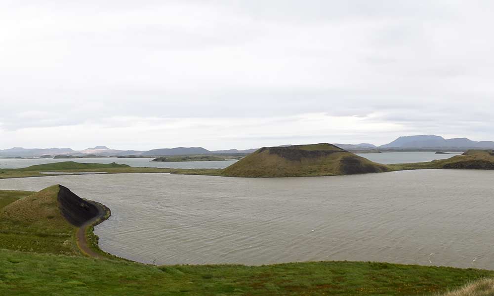 Durch das Hochtemperaturgebiet Námaskard erreichten wir 14.30 Uhr am Rand des Sees die Pseudokrater bei Skútustaðir. Diese sind vor einigen Tausend Jahren dadurch entstanden, dass Lavaströme aus einem nahe gelegenen Vulkan in diese Gegend strömten und durch die Feuchtigkeit des sumpfigen Bodens Explosionen ausgelöst wurden, die diese dekorativen Pseudokrater schufen.