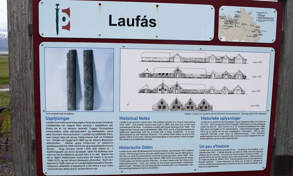 Bevor wir zu unserem Hotel fuhren, wollten wir noch den Bauernhof Laufás besuchen. Dieses sehenswerte Gehöft - eines der schönsten noch erhaltenen Torfgehöfte Islands - stammt aus den Jahre 1866 und man kann hier sehr gut erhaltene Torfhäuser und eine kleine Kirche besichtigen.