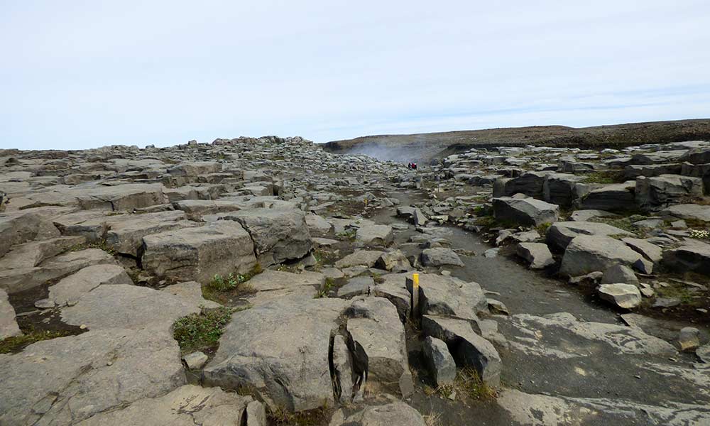 Unsere Route führte uns nun zu Europas mächtigstem Wasserfall, dem Dettifoss. Zuerst erreichten wir auf der Ringstraße die Zufahrt über die alte Schotterstraße, die man nur mit Allradfahrzeuge befahren sollte. Einige Kilometer später bogen wir in die neu gebaute Asphaltstraße ein und erreichten nach 10 Minuten den Parkplatz zum Wasserfall.