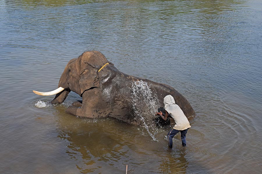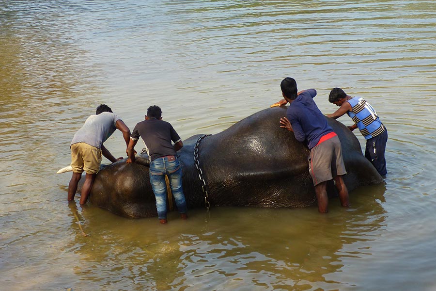 Bis auf einen Ausrutscher und ein nasses Hosenbein ging alles gut und wir konnten im Camp beobachten, wie die Elefanten im Fluss badeten und gewaschen wurden, was sie augenscheinlich genossen.