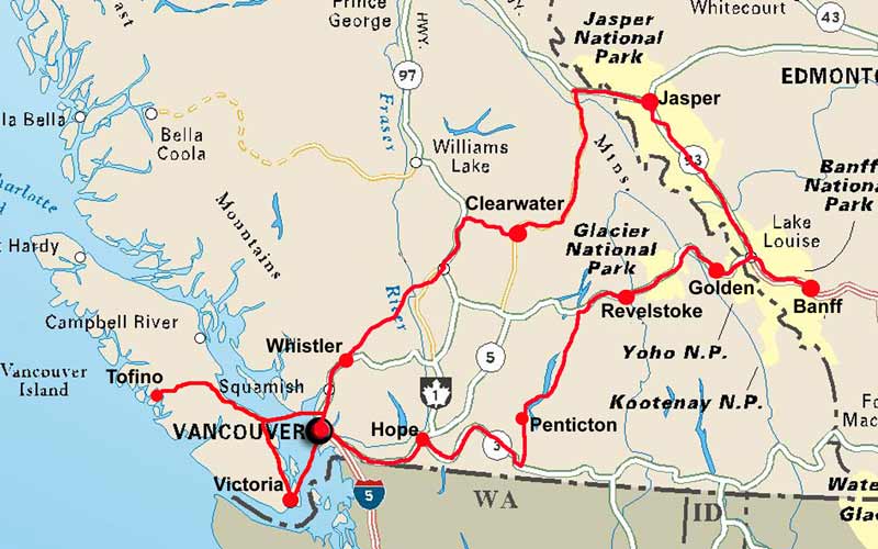 Von dort weiter in den Jasper-Nationalpark und zurück über Claerwater und Whistler auf Vancouver Island.