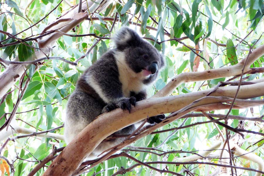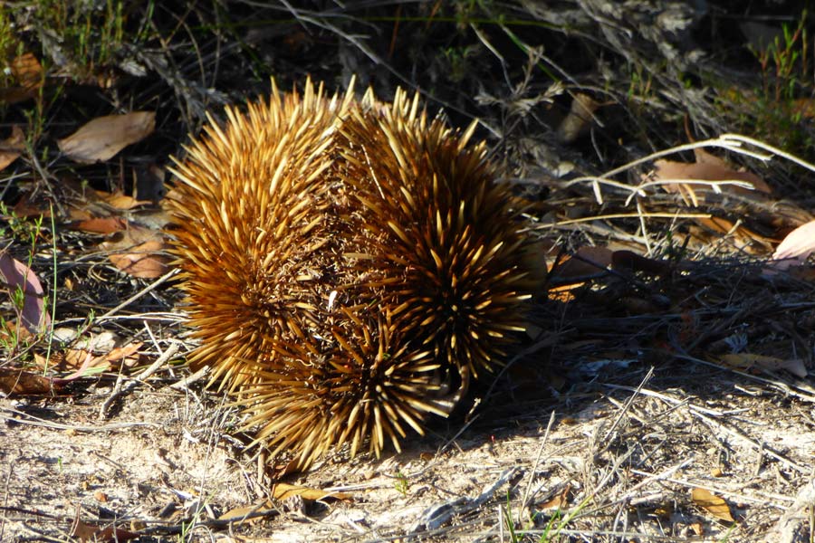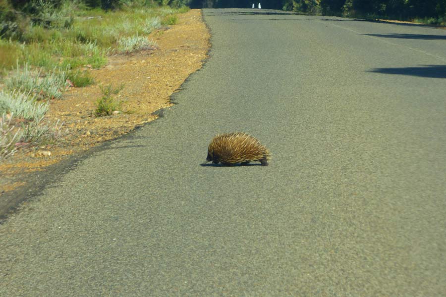 Auf der Rückfahrt wanderten wir noch den Trail am Besucher-Center entlang, um einige Tiere zu erspähen, gaben aber nach 20 Minuten auf und gingen zurück zum Parkplatz, wo wir einen Koala auf dem Baum sitzen sahen. Später lief vor unserem Auto ein putziger Echidna über die Straße. Als wir näher kamen, verkroch sich das Tier leider gleich im Gestrüpp.