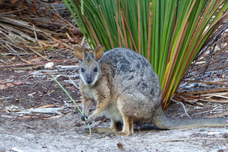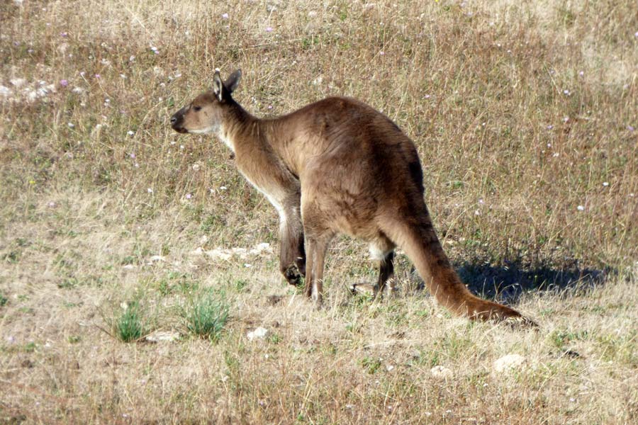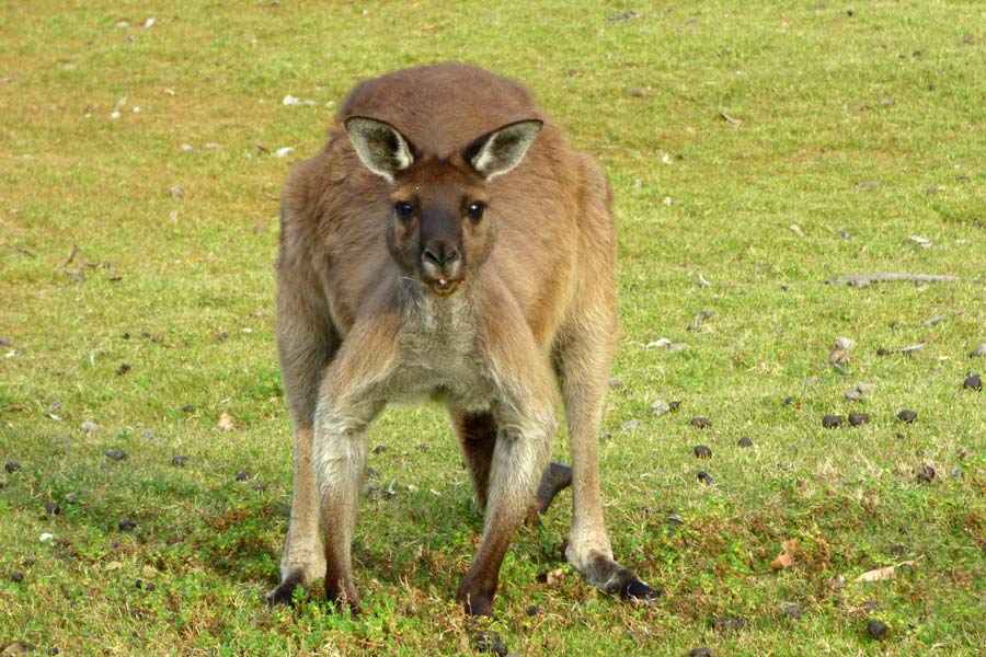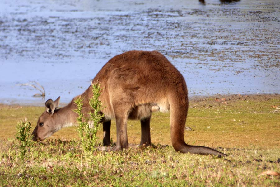 Da wir die Fähre um 10.30 Uhr gebucht hatten, mussten wir um 6.45 Uhr aufstehen und nach dem Frühstück um 7.30 Uhr abfahren. Es war noch ziemlich kühl und die Autoscheiben beschlugen. Unterwegs sahen wir wieder viele tote Tiere am Straßenrand liegen. Auf dem Weg machten wir einem Abstecher zum Paddington Bay und beobachteten danach auf einer Wiese einige Riesen-Kängurus bei Frühstück.