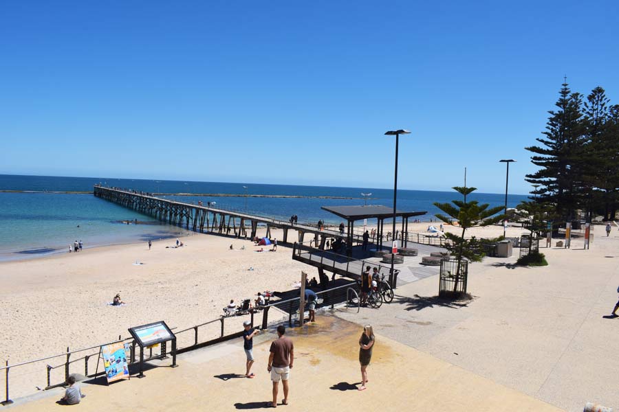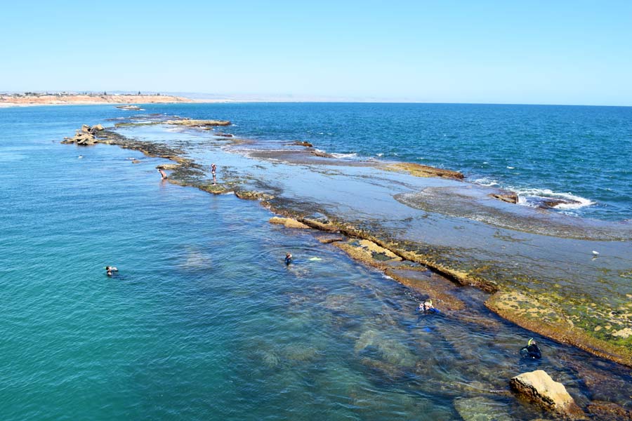Unterwegs machten wir Pause in Port Noarlunga, einem schönen Badeort ca. 30 km vor Adelaide. Dort suchten wir uns einen Parkplatz und spazierten bis zum Ende der Landungsbrücke. Hier konnten wir den vielen Schnorchlern zusehen, die am langen Riff, das parallel zum Ufer verläuft, nach Fischen Ausschau hielten. Anschließend aßen wir in einem Lokal am Strand Fish and Ships.