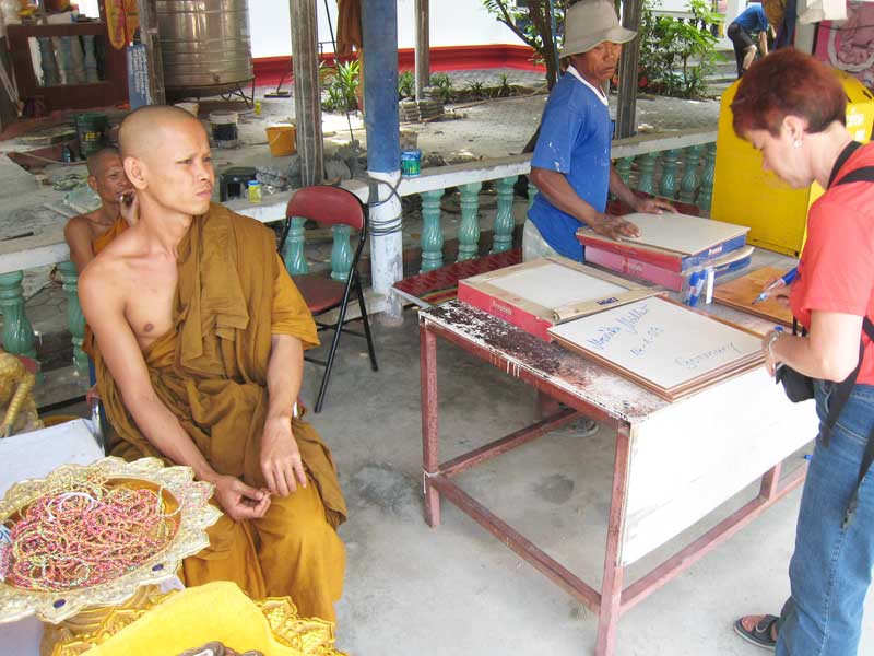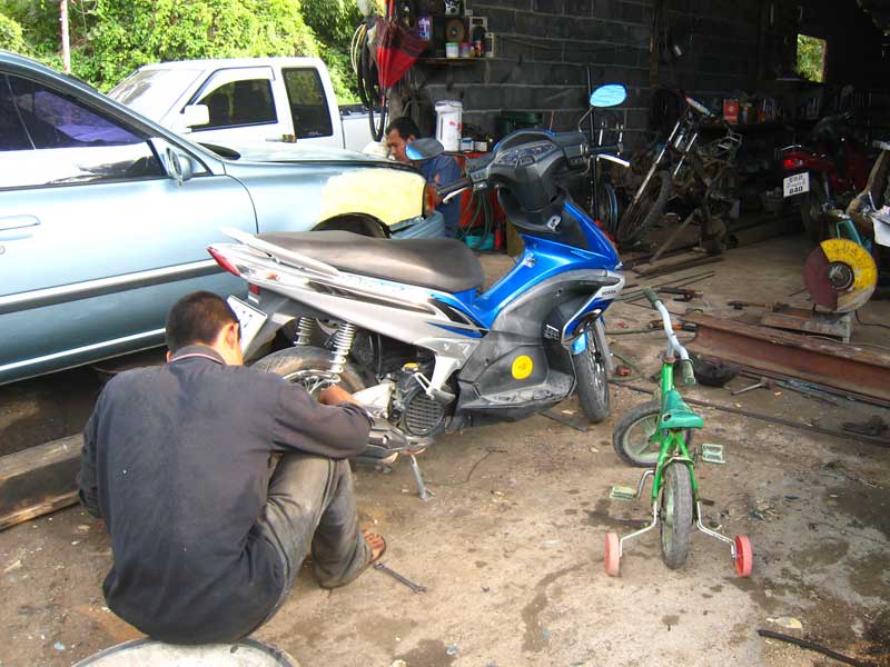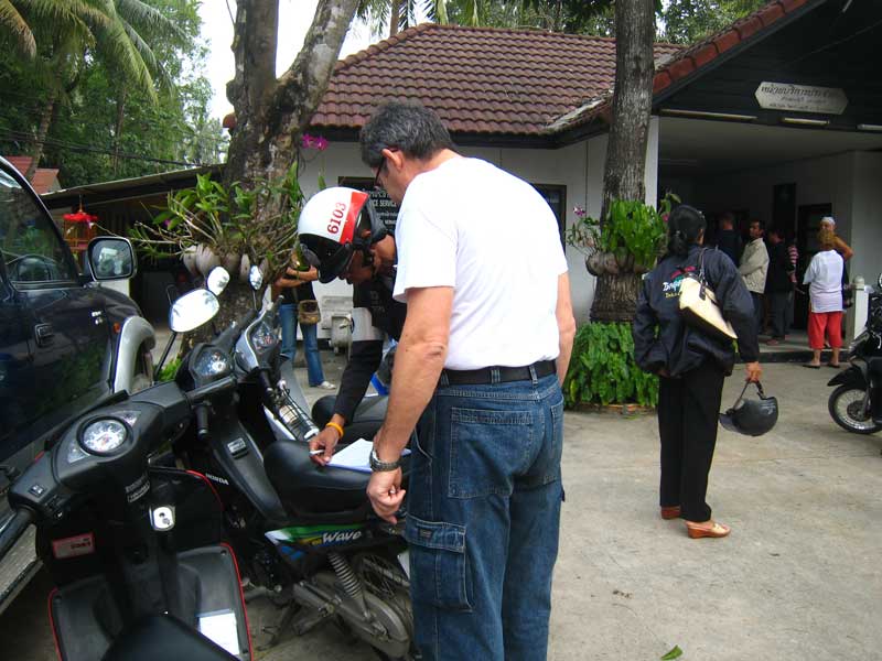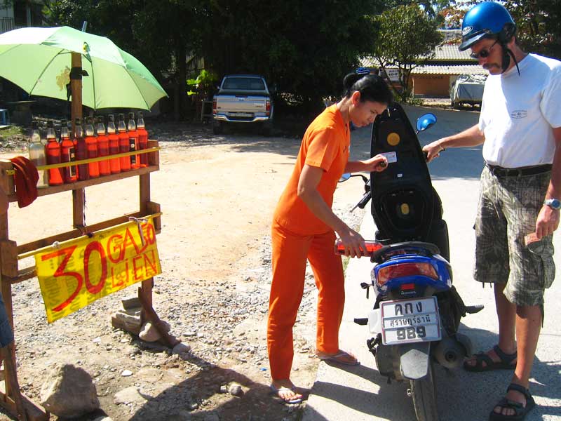 Am Morgen des 14. Januar mieteten wir uns ein Moped, um die Insel zu erkunden. Nach einem Kilometer wurden wir von der Polizei gestoppt und mussten wegen Fahren ohne Helm 300 Bath Strafe bezahlen. Doch wir waren nicht die einzigen Touristen, denen es so ging. Also bezahlen, im nächsten Laden einen Helm kaufen und weiter fahren. Unterwegs mussten wir mehrmals Tanken, wobei es das Benzin in ehemaligen Schnapsflaschen gab. Wir hatten auch plötzlich eine Reifenpanne, so hieß es also die nächste Werkstatt suchen und den Schlauch wechseln lassen. Dazu mussten wir zuerst Geld geben, damit schickte man einen Mann in den nächsten Ort, um einen neuen Schlauch zu kaufen. Nach 1,5 Stunden konnten wir dann unsere Fahrt fortsetzen.