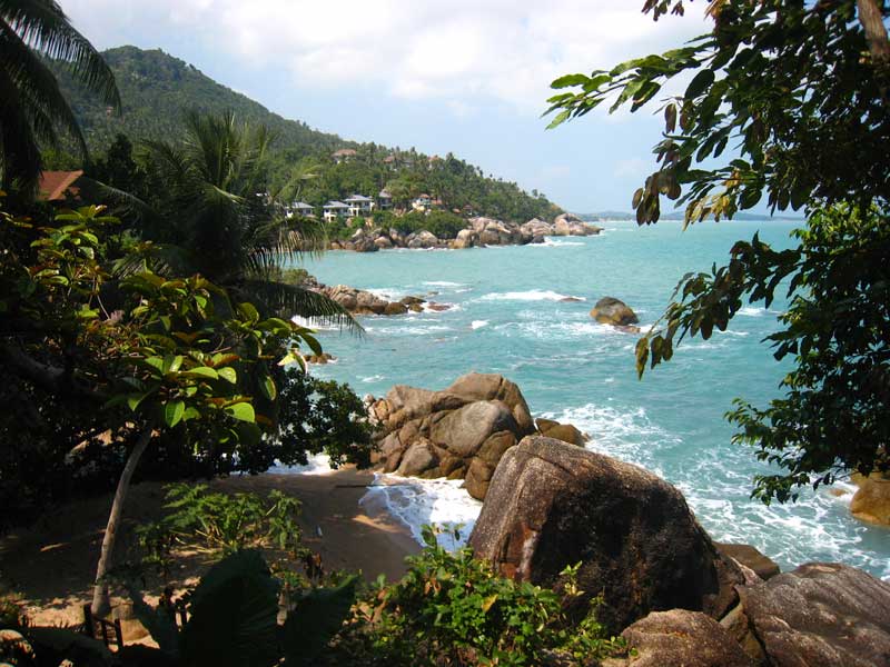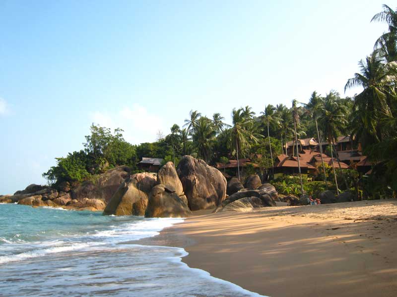 Wir bewohnten einen schönen an Hang gelegenen Bungalow und es waren nur einige Treppenstufen bis zum herrlichen einsamen Hotelstrand, der zwischen den großen Felsen eingebettet war.