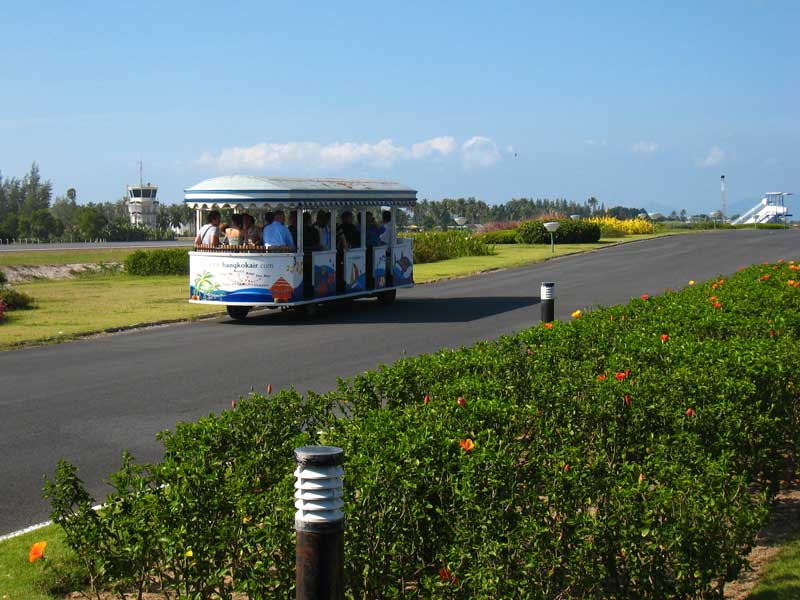Nachdem wir am Vormittag des 21. Januar noch mal den herrlichen Strand genossen, wurden wir 14 Uhr zum Flughafen abgeholt. Der Flughafen in Koh Samui ist ein richtiges Schmuckstück in einem schönen Park und zum Flugzeug wird man mit einem kleinen Zug gefahren.