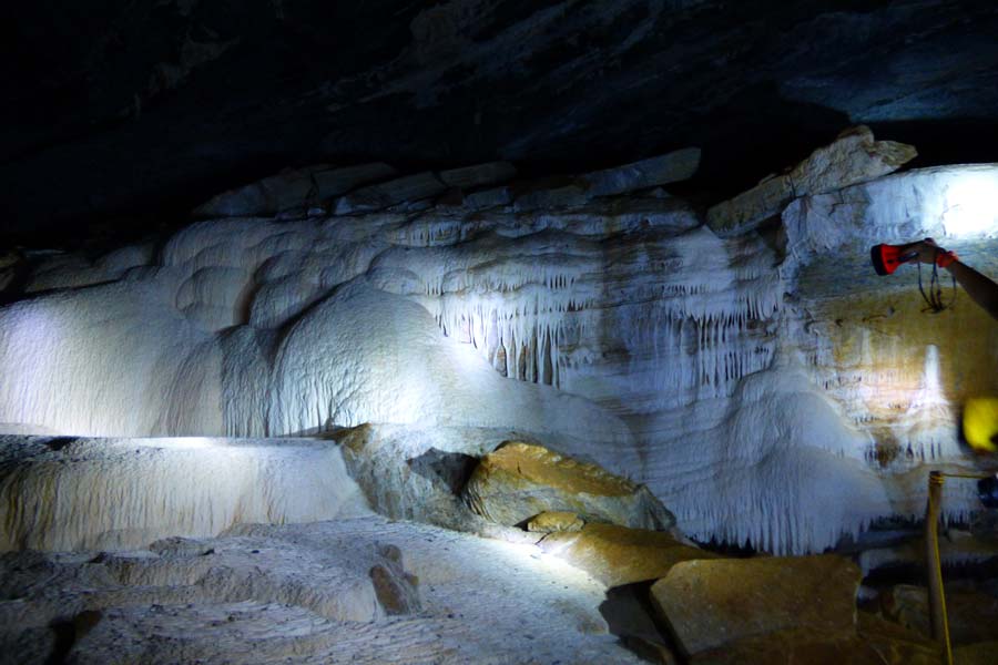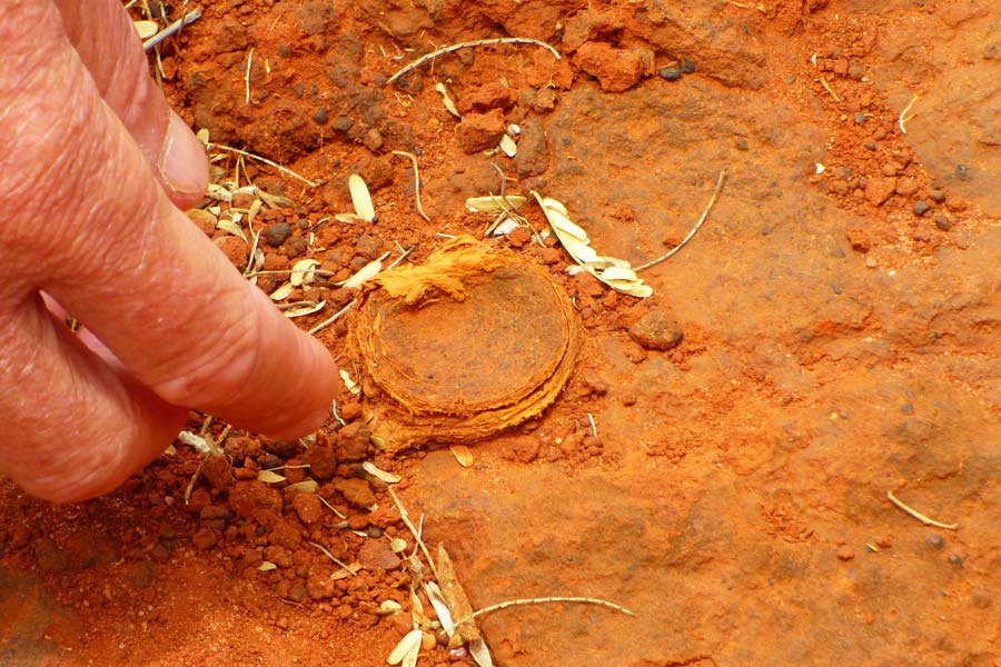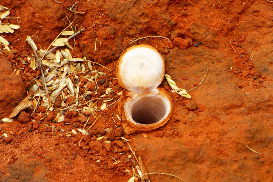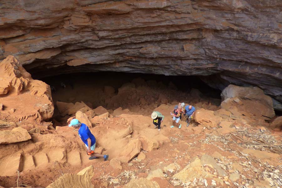 Auch der Eingang zum Nest einer Falltürspinne, wo die Beute durch eine zuschnellende Klappe gefangen wurde, war sehr interessant. Nach einem Ausblick in die felsige Schlucht erreichten wir den Abstieg zur Höhle, in die wir einen knappen Kilometer hinein wanderten, um die Stalaktiten und Stalagmiten in den Lichtkegeln der Taschenlampen zu bestaunen.