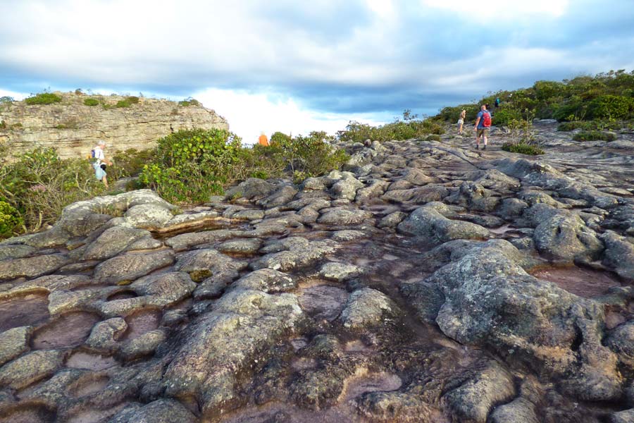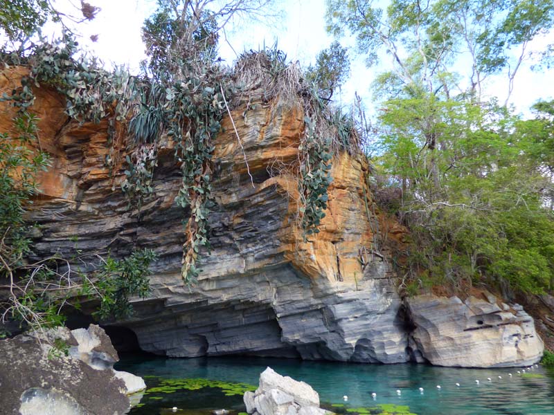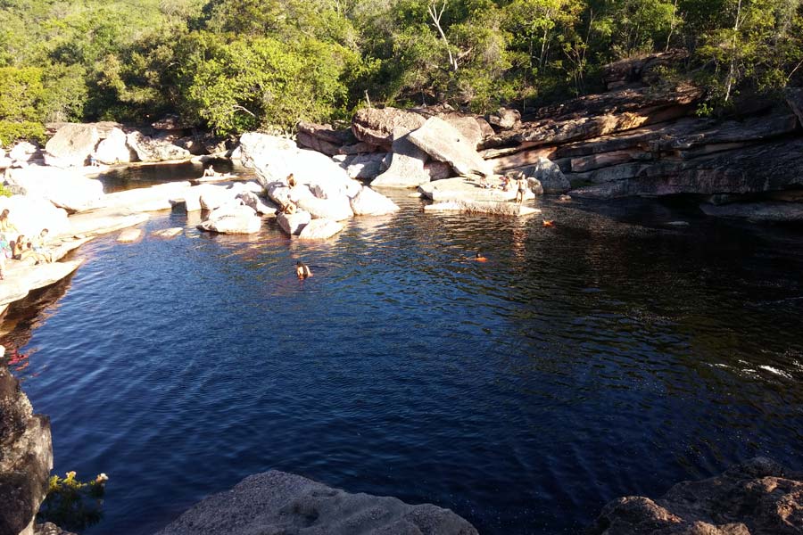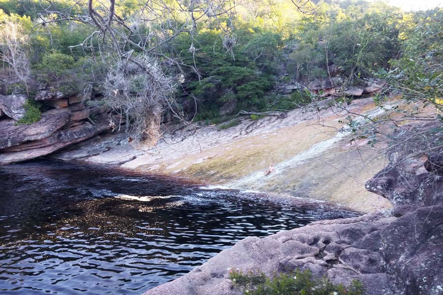 Nach 15 Uhr schlenderten wir den gleich neben der Pousada beginnenden ca. 2 km langen Wanderweg hinab zu einigen natürlichen Pools, die sich in ausgewaschenen Felsen gebildet hatten. Hier konnten wir in dem von Mineralien gefärbten bräunlichen Wasser baden.