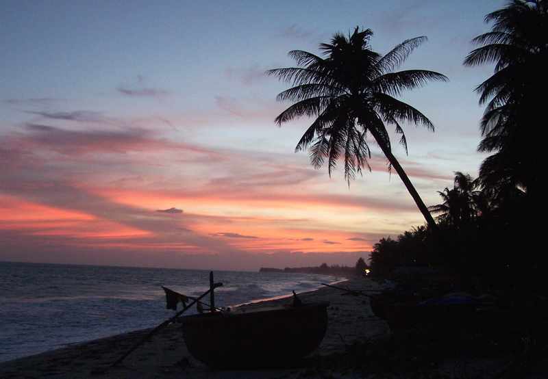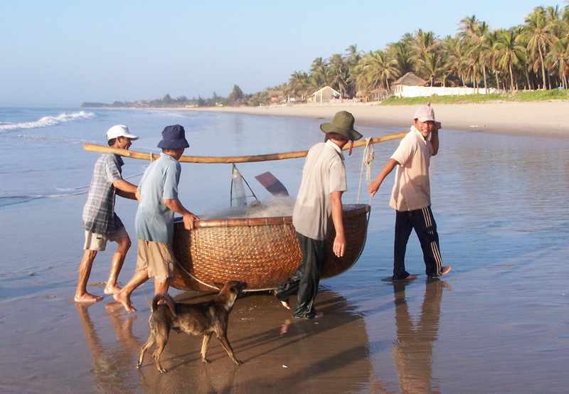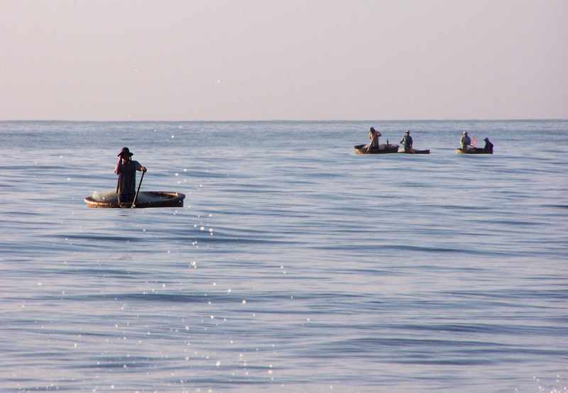 Das Meer lockte uns gegen Sechs Uhr zum Morgenbad und so konnten wir rechtzeitig beobachten, wie die Fischer mit Ihren kleinen runden aus Korb geflochtenen Booten vom morgendlichen sehr kärglichen Fang heimkehrten.