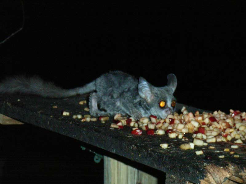 Es war erst 21.30 Uhr, aber in den Camps wird zeitig geschlossen, damit spät abends keine grölenden Horden den Campfrieden stören. Sehr putzig fanden wir ein kleines Buschbaby, welches auf einer kleinen Holzplattform neben den Tischen sein Futter einnahm und zwischendurch immer wieder die Umgebung mit seinen riesigen Augen beobachtete.