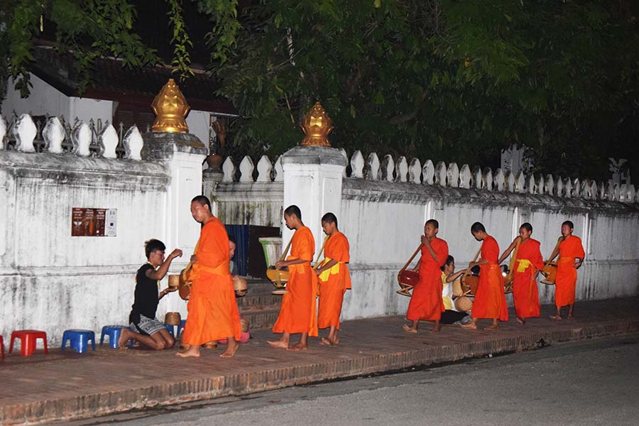 Den täglichen Almosengang der buddhistischen Mönche beim Sonnenaufgang wollte sich Monika auf keinen Fall entgehen lassen und so hieß es für sie bereits um 5.30 Uhr aufstehen. Es ist für die Menschen eine Ehre, wenn die Mönche den Klebreis entgegennehmen und nicht die Mönche danken für die Gabe, sondern die Menschen bedanken sich bei den Mönchen, um den Respekt für deren Lebensweise auszudrücken - ein uns unbekannter Glaube.