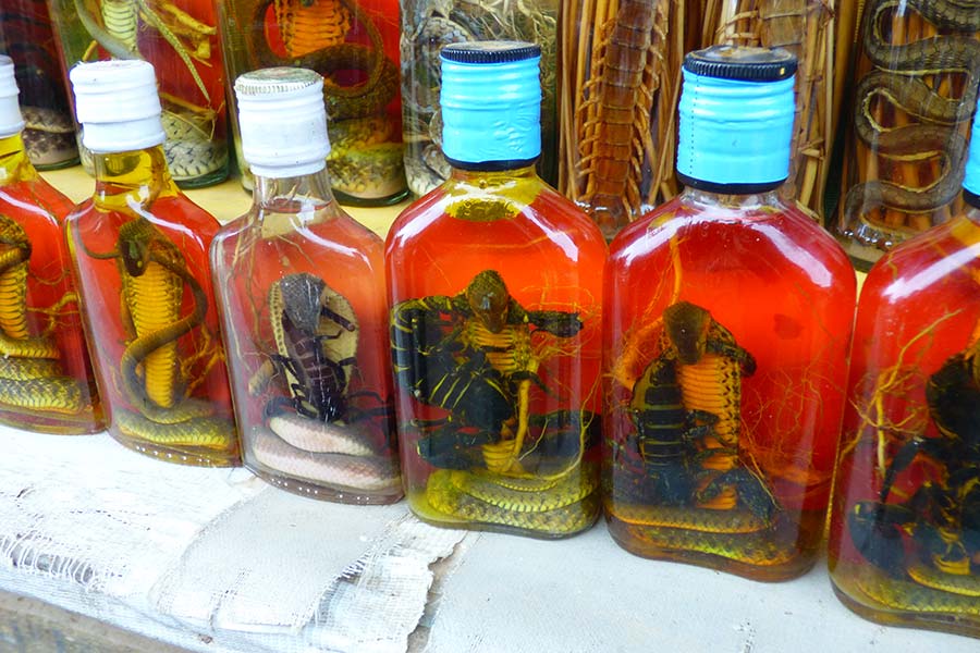 Unterwegs besuchten wir das Dorf Xanghay, welches für seine Whisky-Produktion und die Webkunst bekannt ist. Gleich beim Aussteigen konnten wir an den Verkaufsständen die Flaschen mit in Alkohol eingelegten giftigen Tieren bestaunen, die besonders gern von den Chinesen gekauft werden. Alles, was kreucht und fleucht wird in Laos gefangen und irgendwie verwertet - für uns unverständlich...