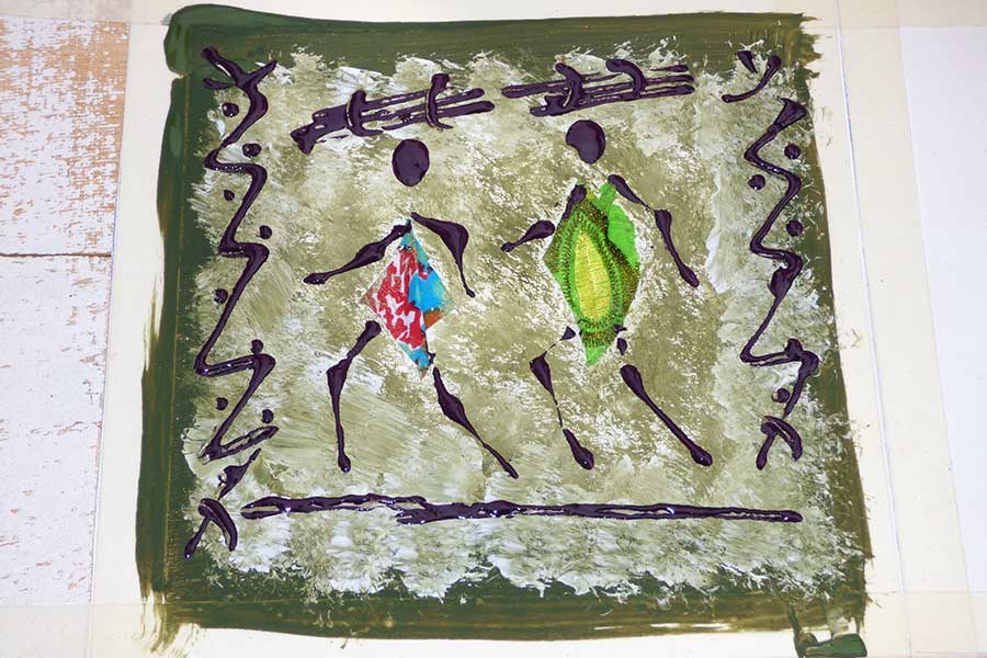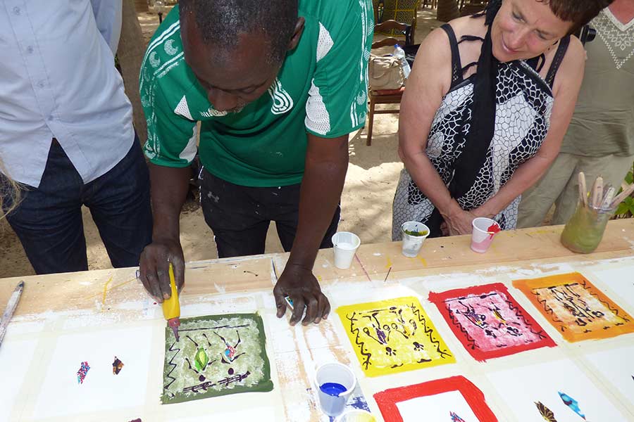 Wir beschlossen heute den Rest des Tages auf einer der zahlreichen Liegen unter den Palmen im Hotel zu verbringen und uns vor der doch etwas langen Heimreise noch auszuruhen. Mamadou sammelte von jeder Person 15 Euro für die während der Reise im Bus angebotenen Wasserflaschen ein. Nach einem kleinen Mittagssnack baute ein aus Dakar angereister Makler der Künstlerkooperative Goorgoorlou einen Tisch mit kleinen Leinwandstücken auf. Auf diesen waren kleine bunte Stoffstückchen geklebt. Dort durfte jeder nach einer kleinen Anleitung einen farbigen Rahmen um das Bild malen und er stellte es mit gekonnten Pinselstrichen fertig. Leider nutzten das Angebot nur wenige aus unserer Reisegruppe. Uns hat es viel Spaß gemacht und es ist ein schönes Reiseandenken.