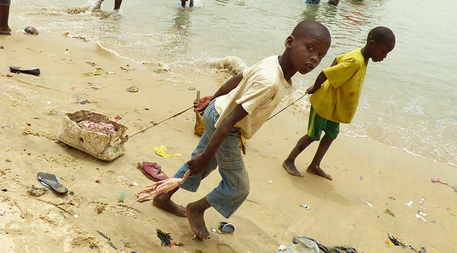 Zurück im Hotel unternahmen wir einen einstündigen Strandspaziergang bis zur rechts vom Hotel liegenden beschaulichen Lagune. Dort kamen wir mit einigen jungen Männern ins Gespräch, die uns anboten, am nächsten Vormittag für 10.000 CFA pro Person für eine Stunde eine Lagunenrundfahrt mit einer Piroge zu machen. Wir sollten am besten gleich buchen, was wir natürlich nicht taten.