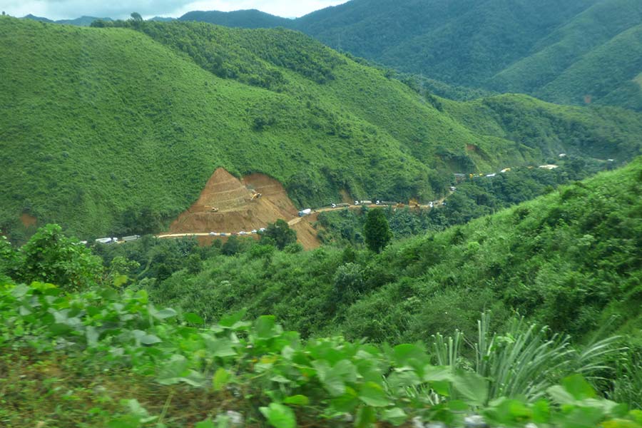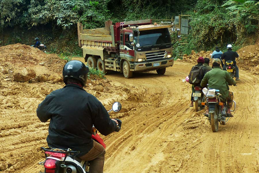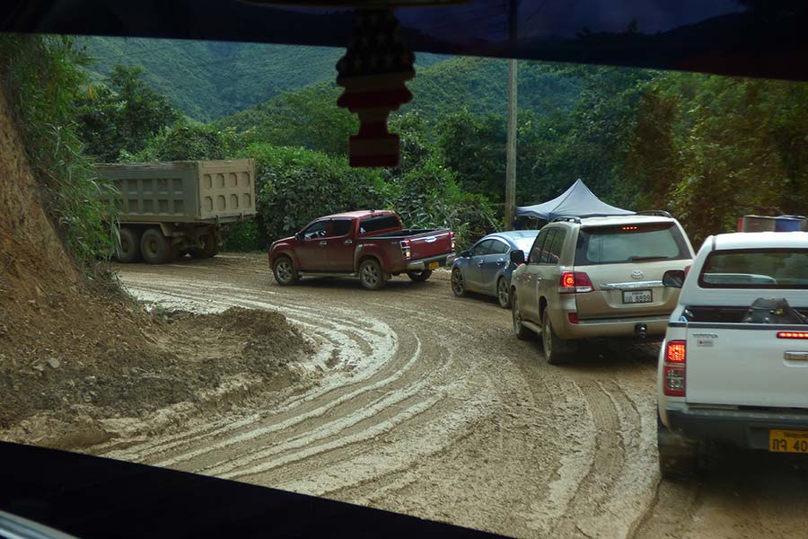 Eine Abwechslung brachte nach einer Stunde Fahrt kurz hinter dem Dorf Xieng Ngeun eine Baustelle. Die Straße war durch einen Erdrutsch verschüttet und wurde gerade beräumt. Wir mussten fast eine halbe Stunde warten, bis es weiter ging.