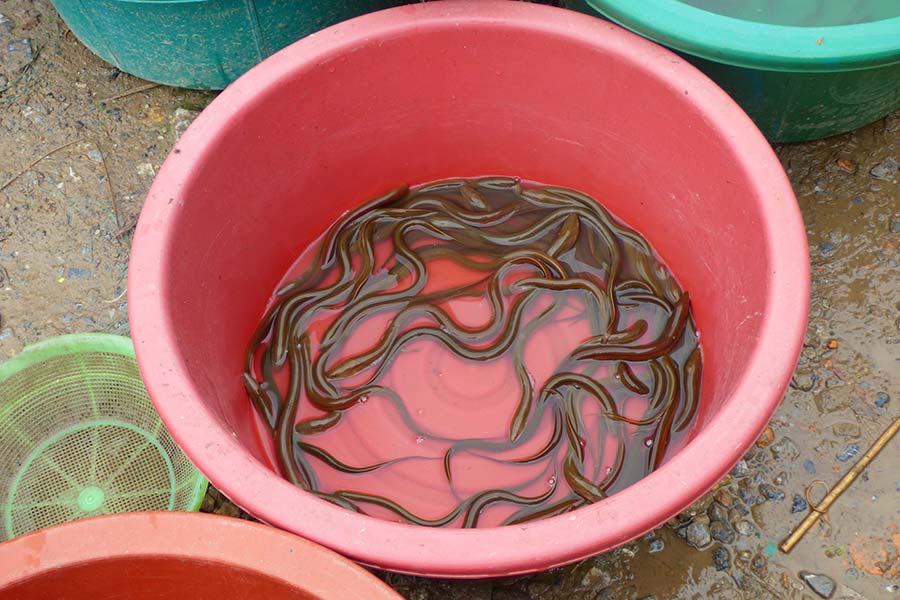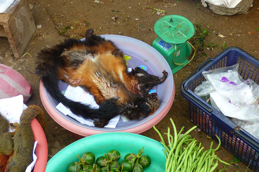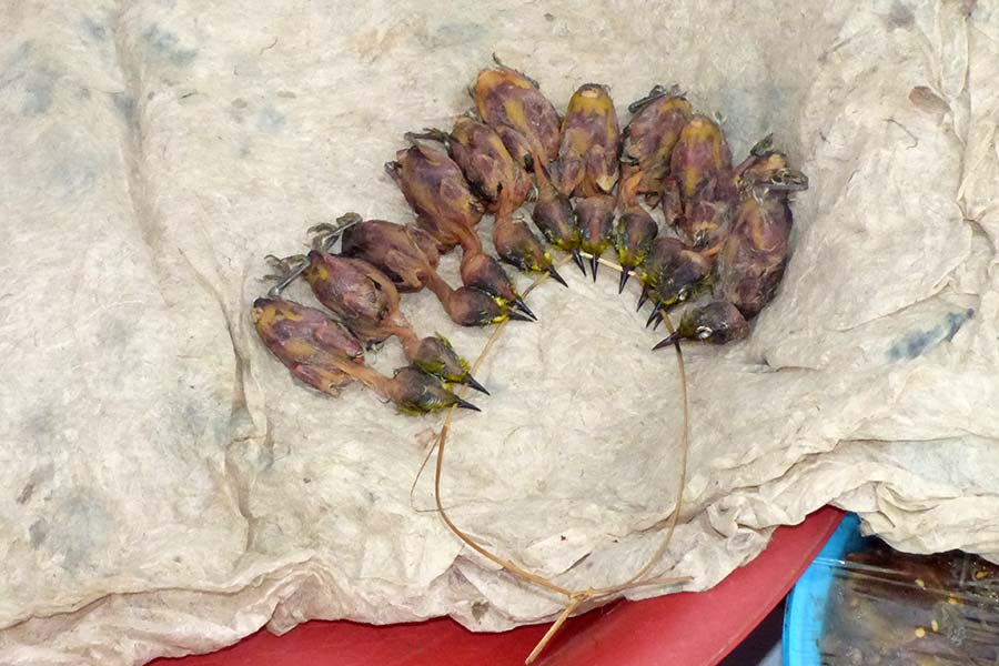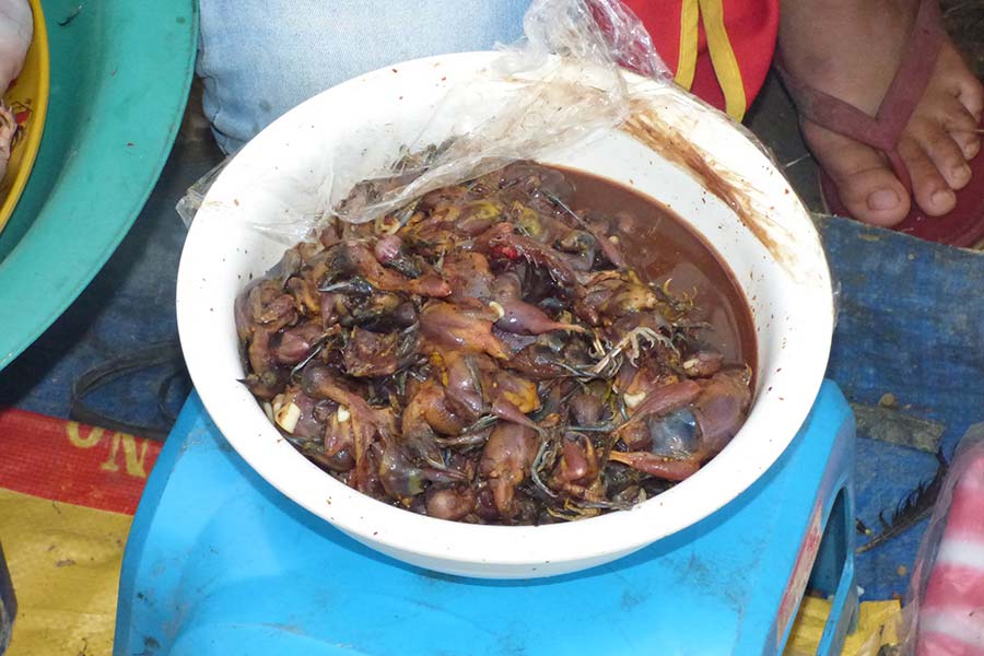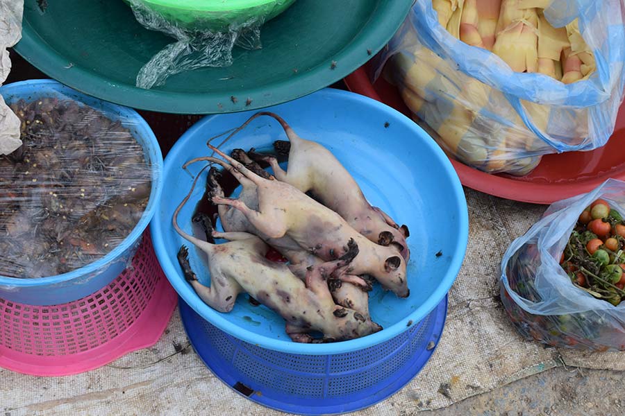 Das Angebot versetzte uns erneut ins Staunen, es reichte von lebenden Käfern, gegrillten Fröschen und Ratten über Bienenwaben bis hin zu toten Singvögeln, Flughunden, Eichhörnchen und anderen exotischen Speisezutaten.