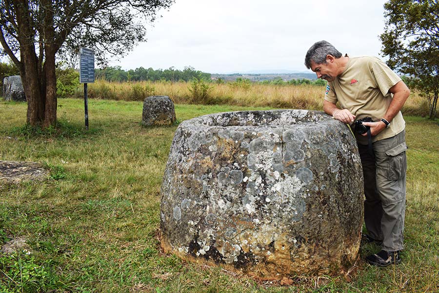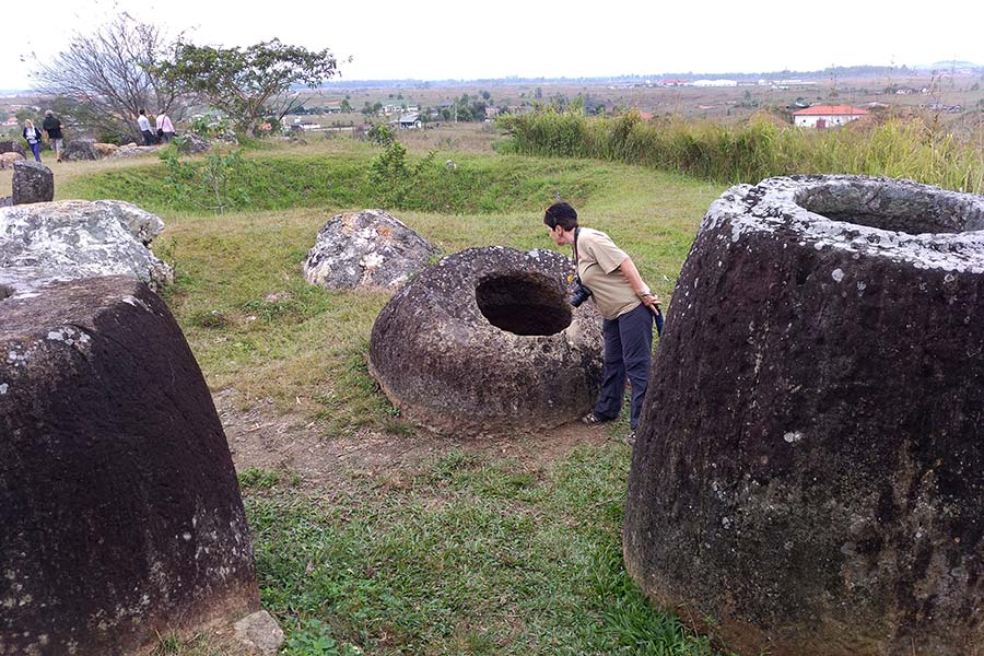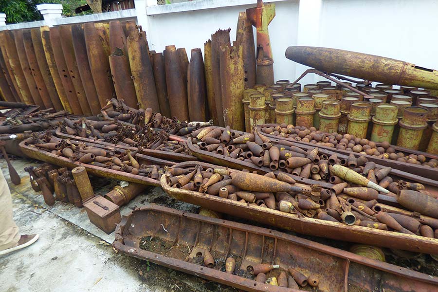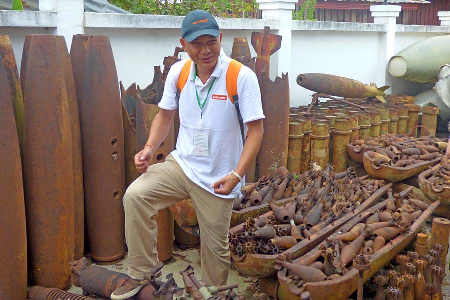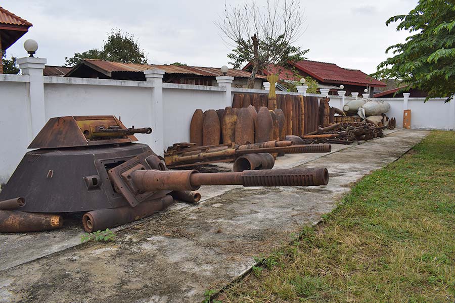Danach besichtigten wir eine „traurige“ Ausstellung. Hinter dem Tourist Office lagen Bomben und Granaten in allen Größen und Formen, die die Amerikaner im Vietnamkrieg über Laos abgeworfen haben. Unser Guide hatte selbst einige Jahre bei einem Bombenräumungs-Trupp gearbeitet und konnte uns viele Storys erzählen. Selbst bei traurigen Themen verlor er nicht seinen ansteckenden Humor.