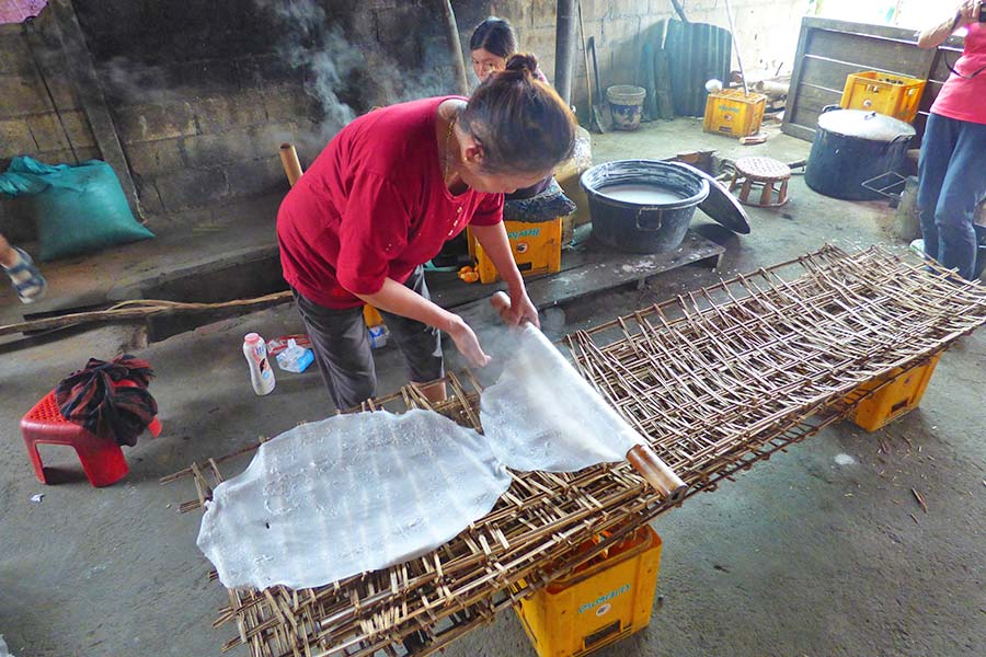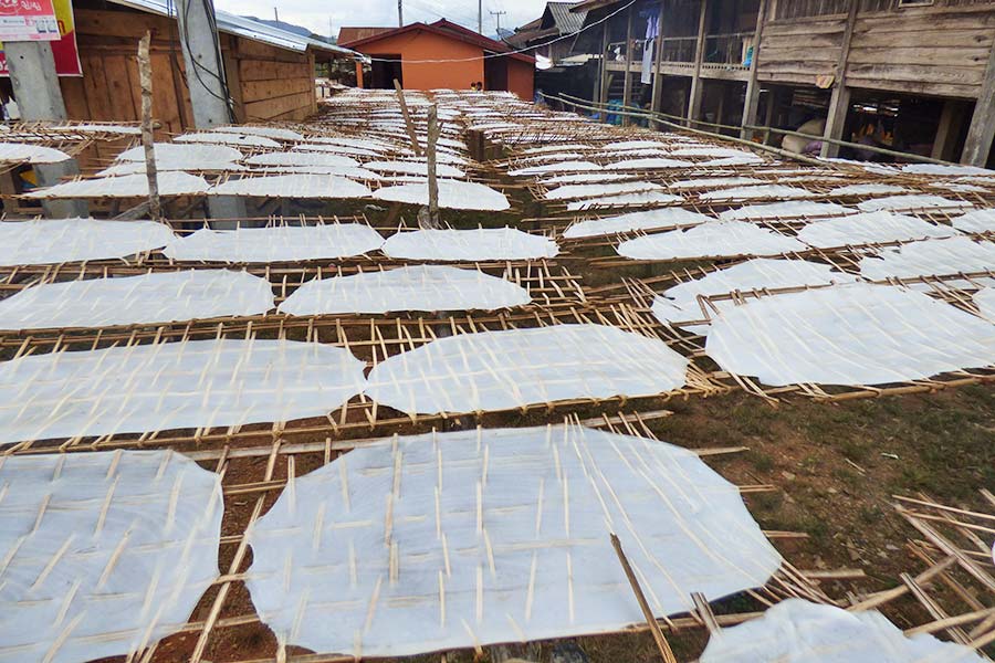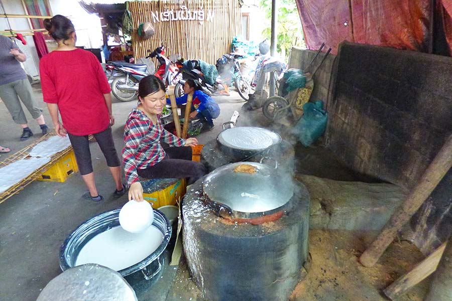 Auf der Rückfahrt machten wir 13 Uhr im Hmong-Dorf NaOu Halt. Hier hat man sich auf die Herstellung von Nudeln spezialisiert, die in ganz Laos begehrt sind. Natürlich mußten wir diese auch bei der anschließenden Mittagspause in einem Restaurant probieren.