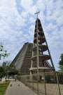 Ein offener Glockenturm aus Beton steht gleich neben der Kathedrale.