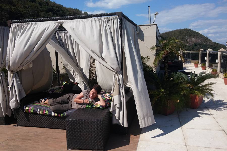 Zurück im Hotel packte Monika die Koffer und anschließend gingen wir noch einmal an den Strand der Copacabana baden. Danach genossen wir ganz allein die Aussicht von der schönen Dachterrasse mit Pool und tranken zum Abschied einen Caipirinha.