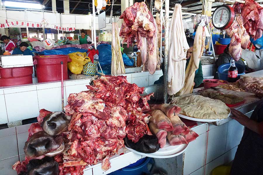 Wir schlenderten noch etwas durch die einzelnen Abteilungen, in denen man angefangen von gehäuteten Fröschen über alle denkbaren Einzelteile von Rindern, Schweinen und Hühnern bis hin zu Käse, frischen Broten und Inkamedizin alles kaufen konnte, was das Herz einer Peruanischen Hausfrau höher schlagen lässt. Alles war sehr sauber und vor allem frisch.
