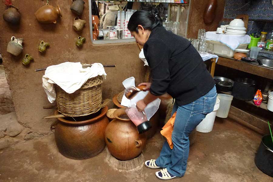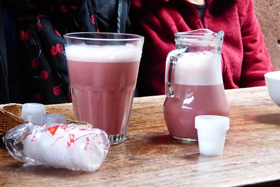 Marco erklärte uns, dass es durch das Fermentieren von Mais und anderer Pflanzen mit Speichel gewonnen wird und daher auch als Spuckebier bezeichnet wird. Von den Frauen wird das Maismehl gekaut und dabei mit viel Speichel angereichert. Danach spucken sie es in ein Gefäß, in dem es mindestens einen Tag stehen muss, damit sich Alkohol bildet.
