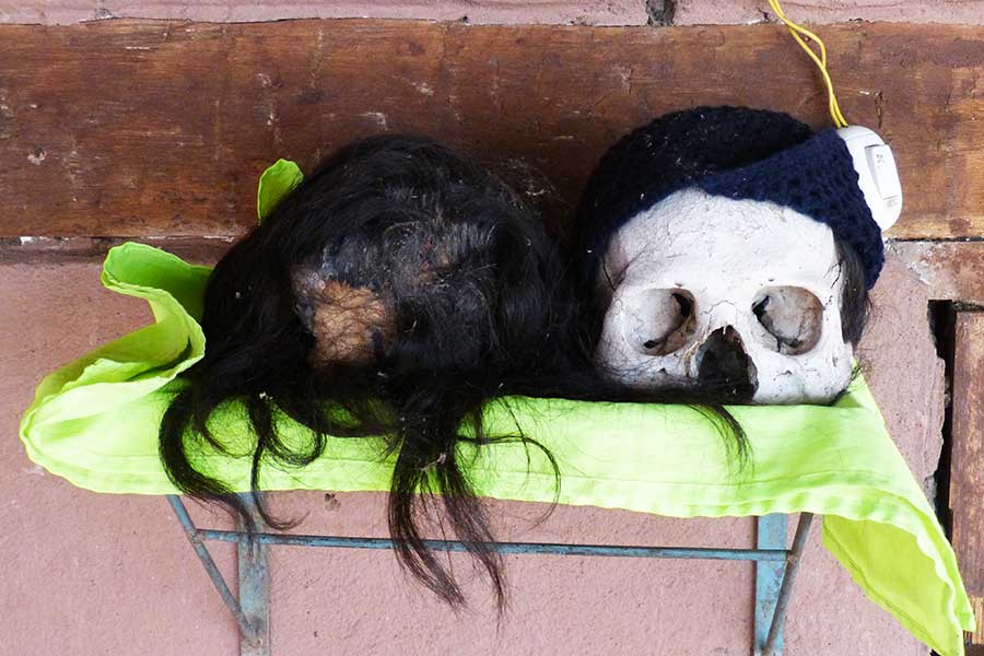Vor dem Haus waren auf einem Tisch die Schädel von verstorbenen Vorfahren aufgestellt; eine alte Sitte, die man in den dörflichen Gegenden Perus oft findet. Man hatte ihnen Haaren, Brillen und Mützen aufgesetzt, denn sie sollen weiterhin am Leben der Familie teilhaben. Und wer soll sich da im Freien erkälten!?